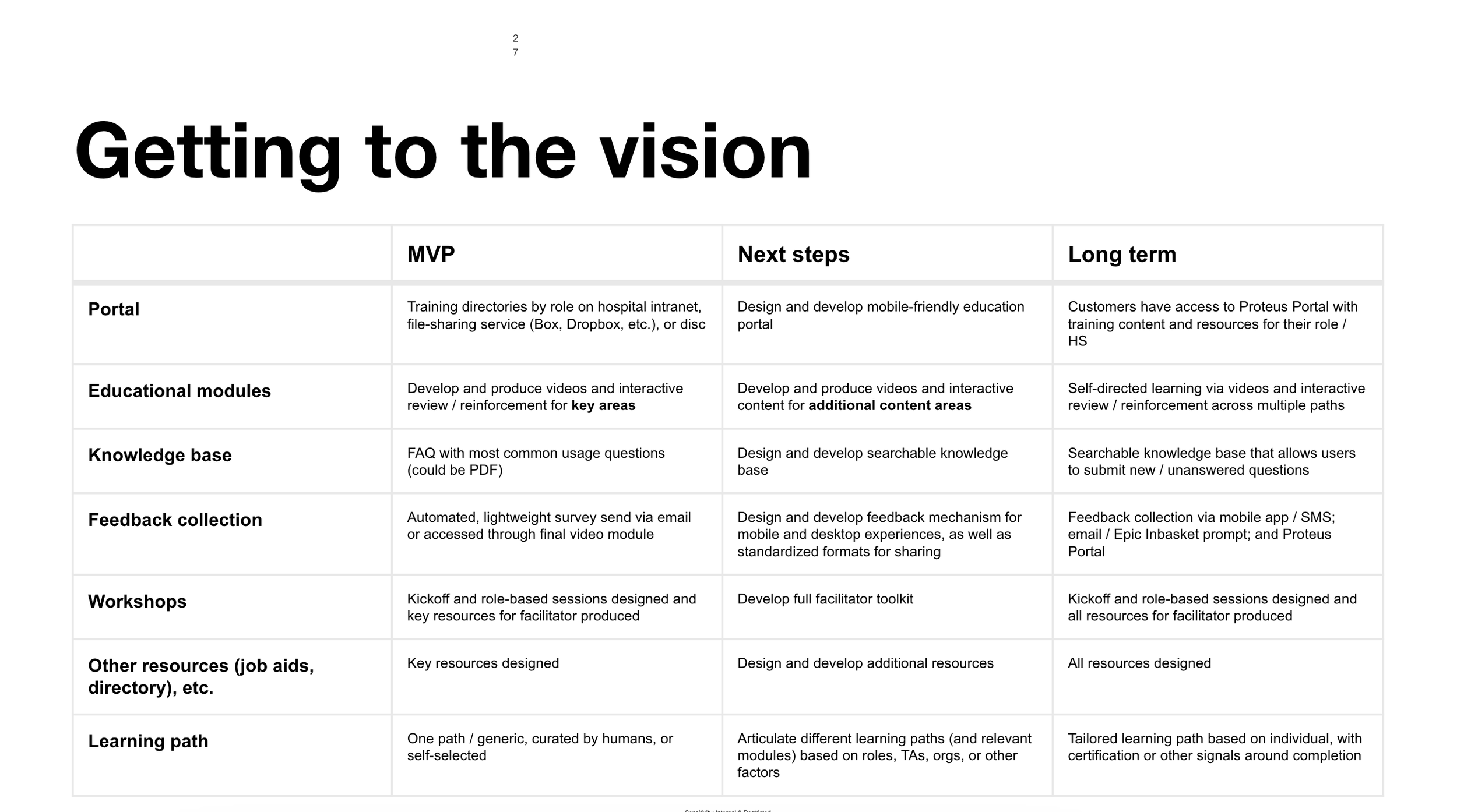 Along with the training vision we worked with the Proteus team to define a MVP that could be implemented immediately with little technology. We also partnered with Wipro technology leadership to define a technical roadmap. (not seen here)